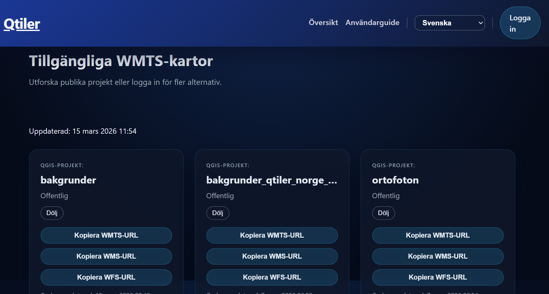 Publicera era lokala QGIS-projekt direkt till webben. Qtiler automatiserar cachning och omvandlar era kartor till högpresterande Vector Tiles och standardiserade OGC-tjänster (WMTS, WMS, WFS) redo för produktionsmiljö.